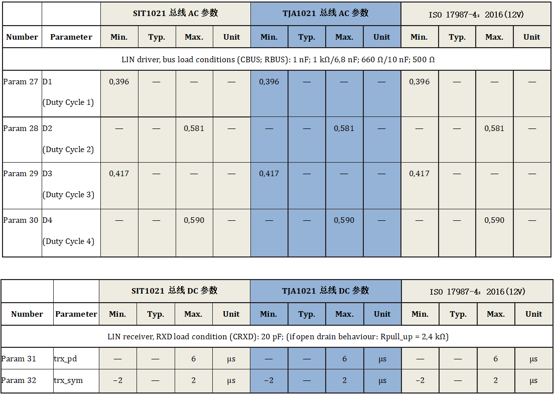 兩款LIN收發(fā)器的DC參數(shù)及AC參數(shù)均符合 LIN 2.0、LIN 2.1、LIN 2.2、LIN 2.2A、ISO 17987-4:2016 (12V) 和 SAE J2602 標(biāo)準(zhǔn),如下表: