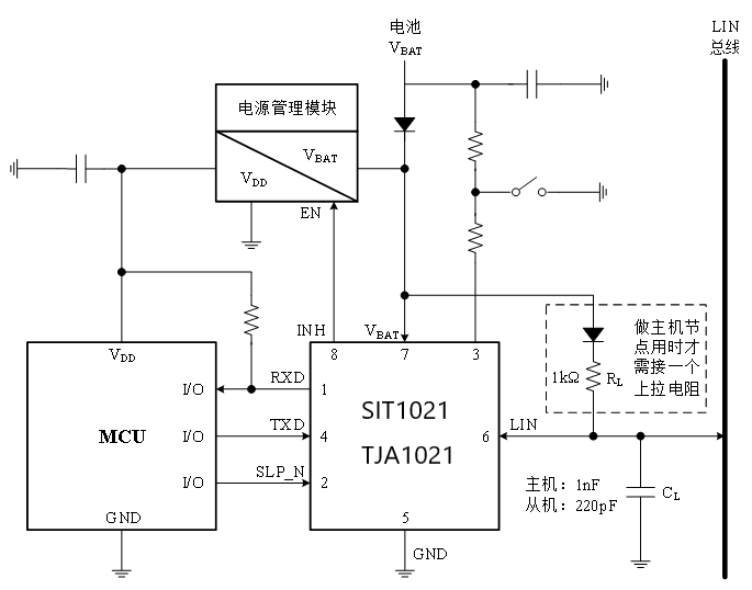 兩款LIN收發(fā)器典型應(yīng)用電路一樣,如下圖: