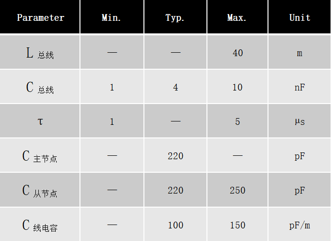C總線 = C主節(jié)點 + n × C從節(jié)點 + C線電容 ×L總線