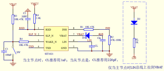 SIT1021在待機(jī)模式、正常模式和上電模式下,INH腳輸出都是高電平(電壓幅值與VBAT相同),只有在休眠模式下輸出才是浮空狀態(tài);如果需要INH腳控制外部電源管理模塊,則需將此腳通過(guò)電阻下拉到地看,如下圖,考慮到功耗,下拉電阻R2推薦使用100K(如果電源管理模塊使能腳內(nèi)部未接下拉電阻,則需要外接下拉電阻,如果內(nèi)部有接下拉電阻,則可根據(jù)實(shí)際應(yīng)用來(lái)決定是否外部加下拉電阻);可根據(jù)電源管理模塊使能腳耐壓,調(diào)節(jié)R1和R2的阻值,以調(diào)節(jié)輸出到電源管理模塊的使能腳電壓。如果不用此功能可以通過(guò)電阻上拉到VBAT,或者懸空。應(yīng)用時(shí)應(yīng)注意,芯片上電后,需將SLP_N腳置高使芯片進(jìn)入正常模式后,才能將其設(shè)置在休眠模式,如上電后直接將SLP_N腳置低,則無(wú)法進(jìn)入休眠模式;另外休眠模式與正常模式可以通過(guò)設(shè)置SLP_N腳來(lái)回轉(zhuǎn)換;如果在休眠模式下,通過(guò)本地喚醒或者遠(yuǎn)程喚醒后,SIT1021先進(jìn)入待機(jī)模式,同時(shí)RXD輸出喚醒標(biāo)志(置低),TXD輸出喚醒源標(biāo)志(置低(弱下拉代表遠(yuǎn)程喚醒,強(qiáng)下拉代表本地喚醒));當(dāng)MCU檢測(cè)到喚醒標(biāo)志后,通過(guò)喚醒源標(biāo)志檢測(cè)到喚醒源,控制SLP_N置高,進(jìn)入正常模式,接收數(shù)據(jù)。